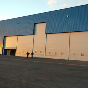 El panel de cierre de la puerta está fabricado con lona vinílica de poliéster de alta tenacidad y antiarañazos, de hasta 1 mm de espesor y 900 g/m2 de peso, con tratamiento anti-UV e ignífugo. Temperatura de trabajo de 5º a 70ºC. La apertura del panel de cierre se realiza mediante un sistema de enrollamiento vertical de la lona con doble eje y contrapeso, que permite velocidades de apertura y cierre de hasta 1,5m/s en función del tamaño de la puerta (otras velocidades disponibles en el departamento comercial).